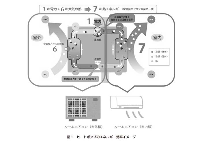 エネルギー効率の高さについて、エアコン暖房を例にしてヒートポンプの仕組みを紹介する(図1)。