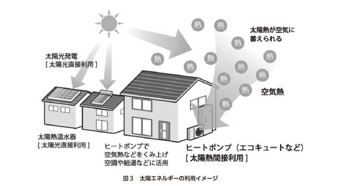 太陽光・風力・地熱・中小水力・バイオマスといった再生可能エネルギーは、温室効果ガスを排出しないエネルギーである。ヒートポンプが利用する大気熱は太陽で温められたエネルギーであり、自然界に存在する永続的に使用可能なエネルギーである(図3)。「エネルギー供給構造高度化法」では、太陽光や風力とならび、ヒートポンプが利用する大気熱や地中熱、河川・海水熱を再生可能エネルギーと定義している。