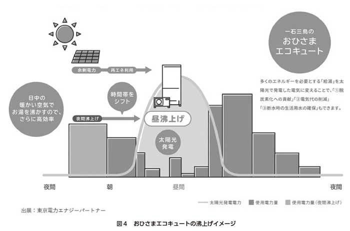 DRの手法の一つとして、家庭用エコキュートを主に太陽光発電設備が発電する時間帯に稼働させ、結果として太陽光発電の自家消費を増やす「おひさまエコキュート」(図4)が登場している。本機は、昼間、外気温度が高い時間帯に稼働することから、従来形(夜間稼働)に比べて機器効率が向上する。現在の導入状況は従来形の導入台数と比べて少ないが、今後、普及台数が増加すれば再エネの有効活用が進むと思われる。