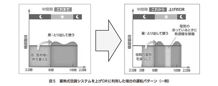 現在、太陽光発電を中心とした再生可能エネルギーの普及拡大に伴い、特に電力需要が減少する中間期において電力供給が上回っている状況にあり、電力需要の創出(上げDR、図5)ニーズが高まっている。そのような背景のもと、蓄熱システムは再生可能エネルギーの受け皿としての役割が期待されている。