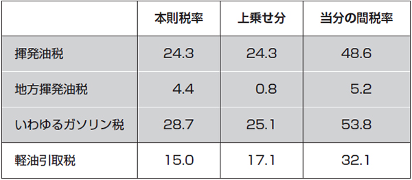 表:ガソリン税・軽油引取税の内訳(単位:円/リットル相当)