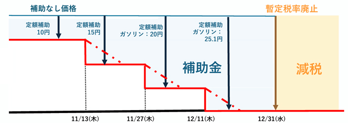 ただ、ガソリン税の暫定税率は12月31日廃止であるが、急激な減税に伴う混乱回避の観点から、実質的な減税効果は、11月13日と27日の5円ずつ、12月11日の5.1円の補助金の段階的増額によって、従来からの10円と加え、段階的に小売価格の値下げとして実現されることとなる。12月31日から、減税額25.1円の値下りが始まる訳ではない。