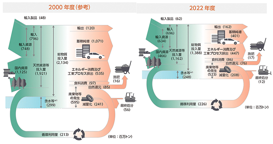 我々の生活や社会活動は、資源を利用し、製品やエネルギーや食料を生産・消費している。廃棄物も発生する。我が国における物質フローを図1に示す。資源は国内外のものだけではなく、発生した廃棄物を処理して循環利用しているものがある。作られた製品は輸出されるほか、土木構造物、建築物、自動車などの耐久財として国内に蓄積される。電力生産や輸送や製鉄、セメント、食料として消費されるものもある。発生した廃棄物は、減量化され、そのごく一部【2.3%】が最終処分される。施肥として自然還元されるものもある。循環利用量は年々増加し、2022年度の最終処分量は2000年度の約5分の1である。