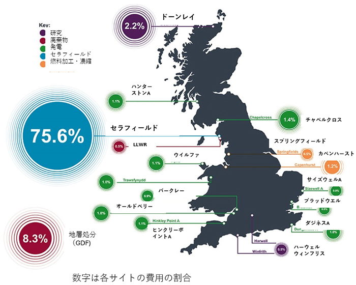セラフィールドには、核兵器用のプルトニウムを生産するために1940年代に原子力施設が作られた。その後、プルトニウム生産用原子炉から取り出した燃料のみならず、第一世代炉のコールダーホール型原子炉の使用済み燃料、第2世代炉の改良ガス炉の使用済み燃料、欧州や日本の電力会社の軽水炉使用済み燃料を再処理(使用済み燃料棒を剪断し、核燃料を硝酸で溶解して、プルトニウムを取り出す化学処理)するための核燃料再処理プラントが次々につくられた。これらは、現在すべて廃止措置中である。スコットランド北端のドーンレイでは、1950年代から高速増殖炉の開発が行われた。高速増殖炉燃料の再処理も行われた。これらの施設の廃止措置が進行している。2019年の報告書によると、廃止措置費用は、セラフィールドが75.6%、地層処分が8.3%、ドーンレイが2.2%と大きい、図2のそのほかの多数の地点は、主に第一世代のマグノックス炉の廃止措置が行われているサイトである。廃止措置費用の100年間の毎年の見込み額も公表されている。英国の会計検査院(NAO)と英国議会は廃止措置の実行状況や予算を継続的に監視し、報告書を公表している。