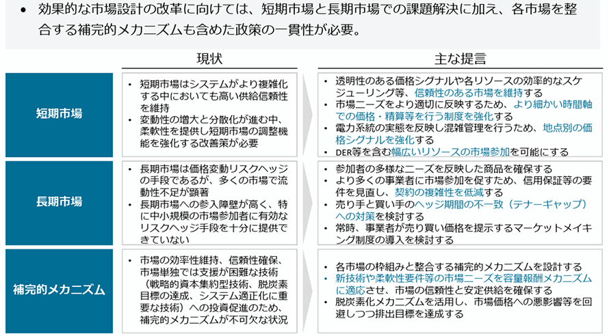 IEAは、大口需要家の長期調達の義務化やPPA需要喚起等による長期需要の創出、標準PPA契約の提供による契約の複雑性の緩和や信用保証手段の開発制度の導入等による中小企業のPPA参加サポート、再エネの出力特性に即した商品設計(ピーク・オフピーク商品、ソーラーシェイプ商品等)などを通じ、長期市場の流動性と透明性を高める必要性を強調している。